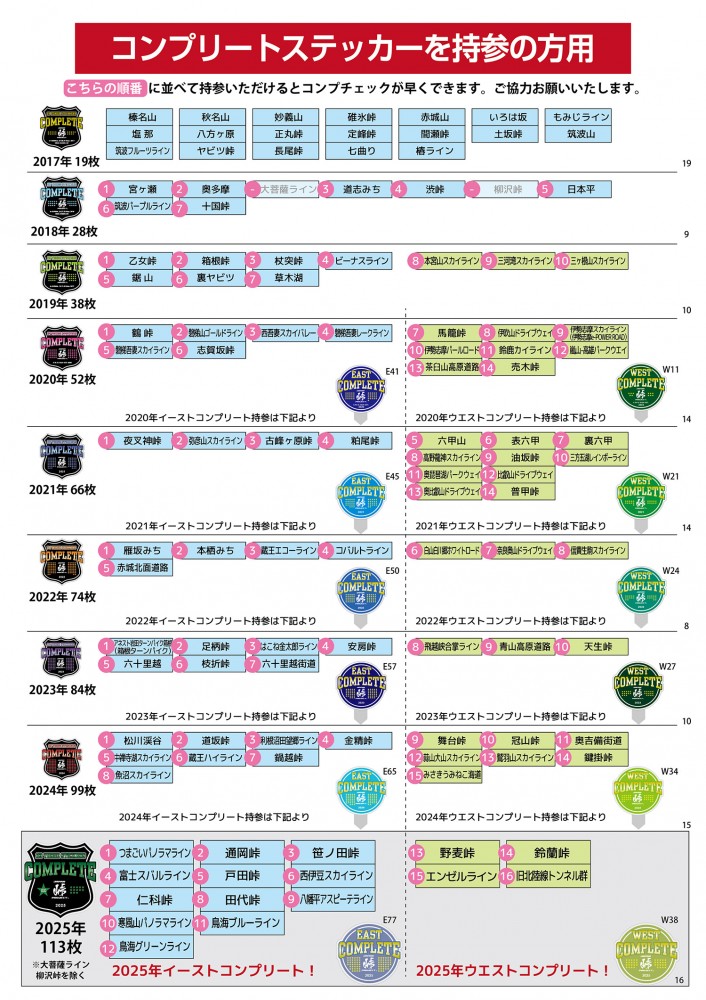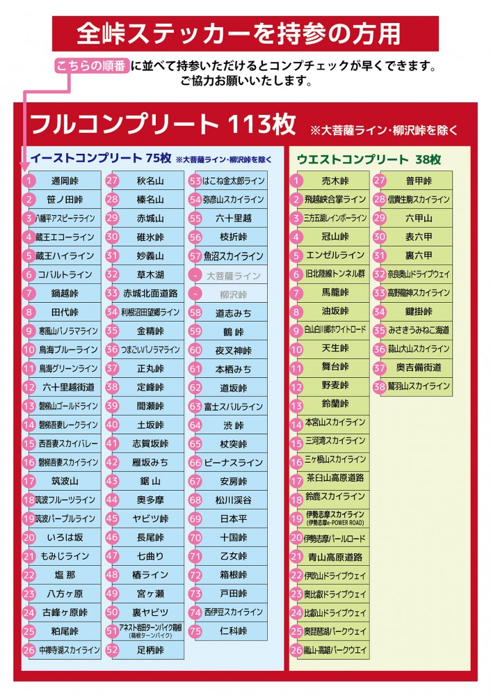 コンプリートした峠ステッカーを持参いただける方は下記の表の順番で準備いただけると助かります。