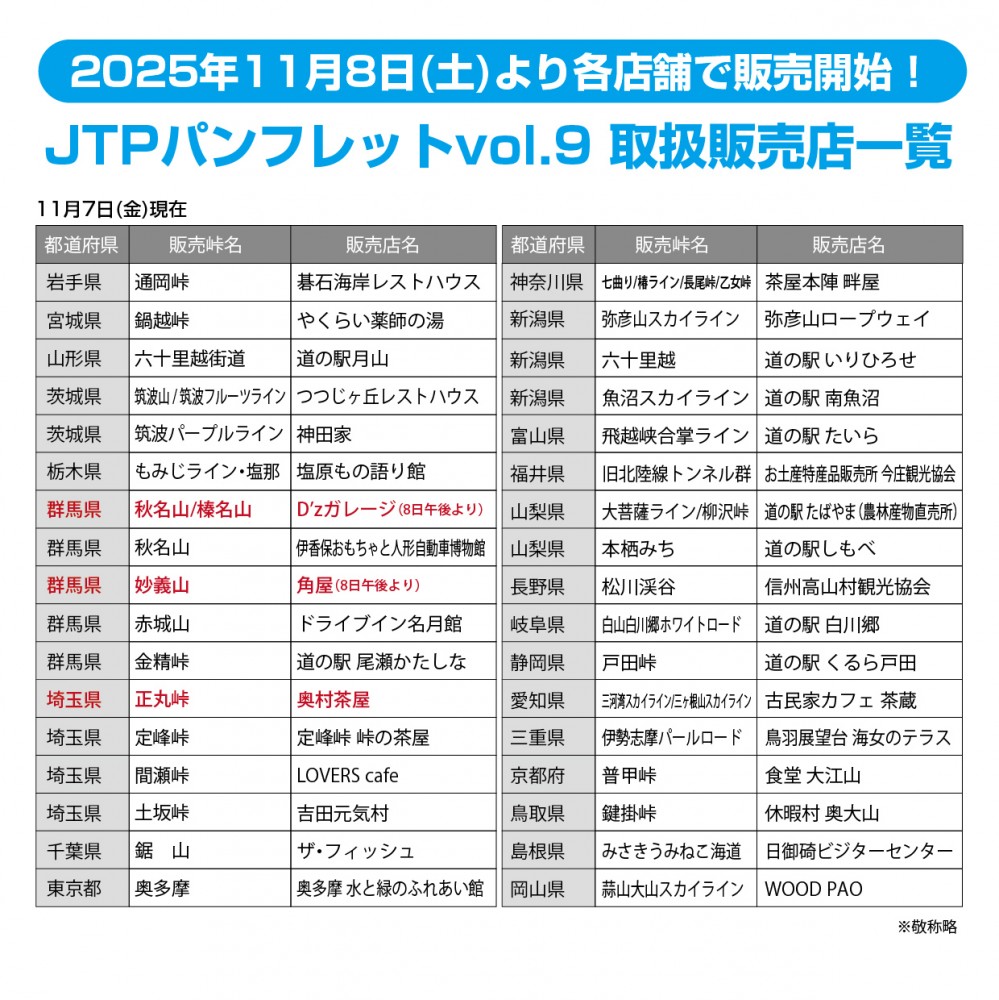 JTPパンフレットvol.9は取扱希望をいただいた下記販売店からも発売となっております。 取り扱い販売店が増えましたら随時更新していきますので、ぜひご来店くださいませ♪ 【追加】 ・群馬県 秋名山/榛名山 D'zガレージ(8日午後より発売予定) ・群馬県 妙義山 角屋(8日午後より発売予定) ・埼玉県 正丸峠 奥村茶屋 2025年11月7日現在